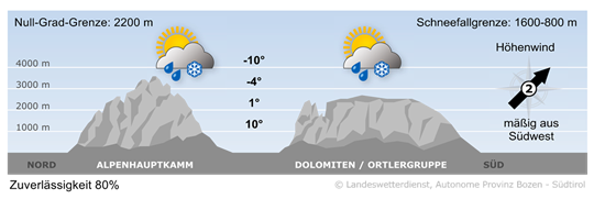 Der Vormittag verläuft überwiegend sonnig. Im Tagesverlauf nehmen die Wolken zu und am Abend muss man recht verbreitet mit Regenschauern rechnen. Die Schneefallgrenze sinkt in der Nacht von 1600 m teils unter 1000 m, dazu frischt böiger Nordwind auf. Am Nachmittag reichen die Höchstwerte von 13° im Wipptal bis 18° im Raum Bozen.
