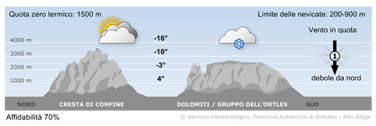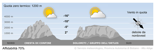 Dopo il diradamento delle nubi residue e basse il tempo sarà abbastanza soleggiato su gran parte del territorio. Temperature minime spesso negative, massime tra 3° a Brunico e 9° a Bolzano.